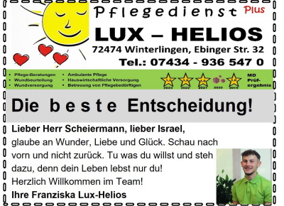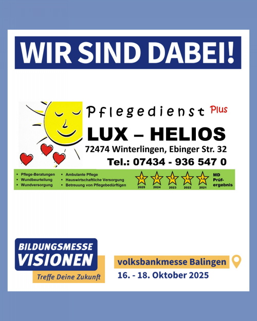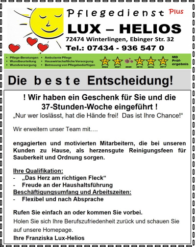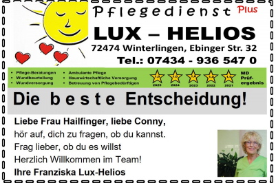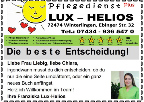 | © Copyright Franziska Lux-Helios, Pflegedienst Plus LUX-HELIOS, 72474 Winterlingen, Ebinger Str. 32, Tel.: 07434 - 936 547 0 | Letzte Änderung: 24.09.2025 | Erstellt mit
